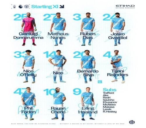 英超第18轮,曼城客战诺丁汉森林,赛前曼城首发阵容已经出炉,具体名单如下: 曼城首发:唐纳鲁马 / 努内斯、鲁本·迪亚斯、格瓦迪奥尔、奥赖利 / 赖因德斯、尼科·冈萨雷斯、贝尔纳多·席尔瓦 / 谢尔基、福登 / 哈兰德