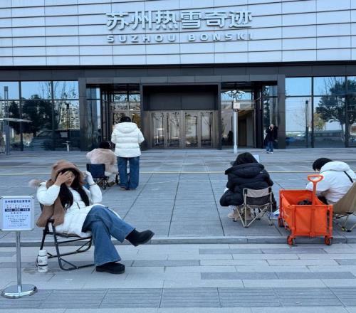 尚未开业,苏州热雪奇迹门口已有不少直播分销达人在售票。图:记者 秦李欣/摄
